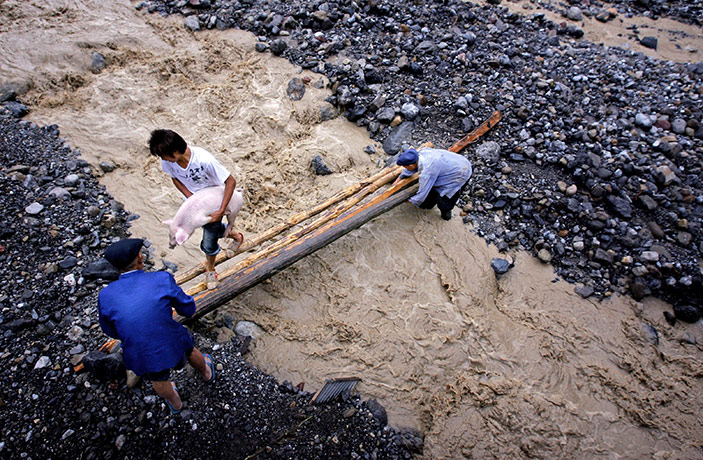Yunnan, China: A villager carries a piglet as two others hold a log bridge for him in the flood-hit Xiaohe township中國雲南:受水災的蕭何鎮上村民搭木橋協助抱著小豬的村民通過
